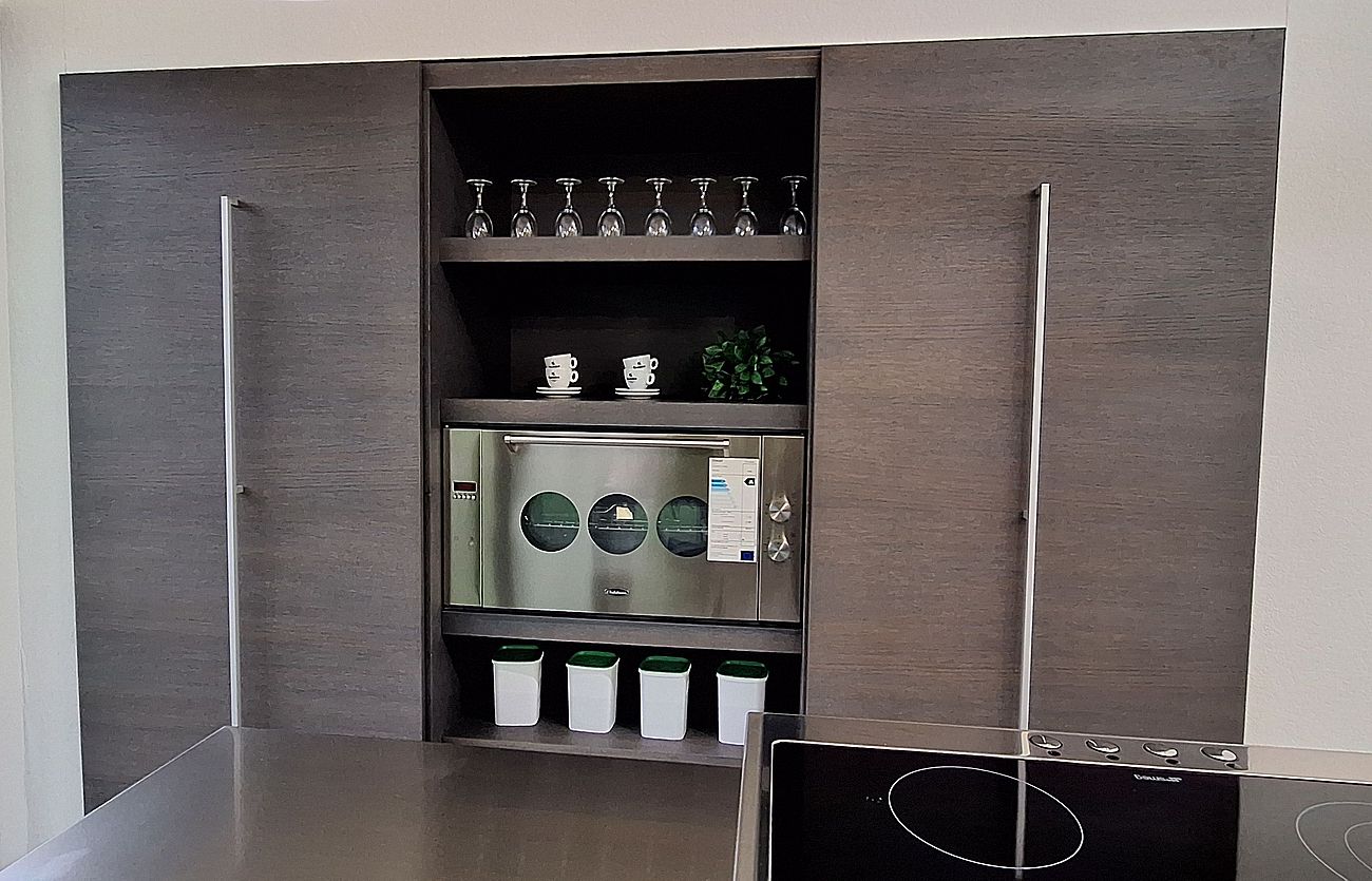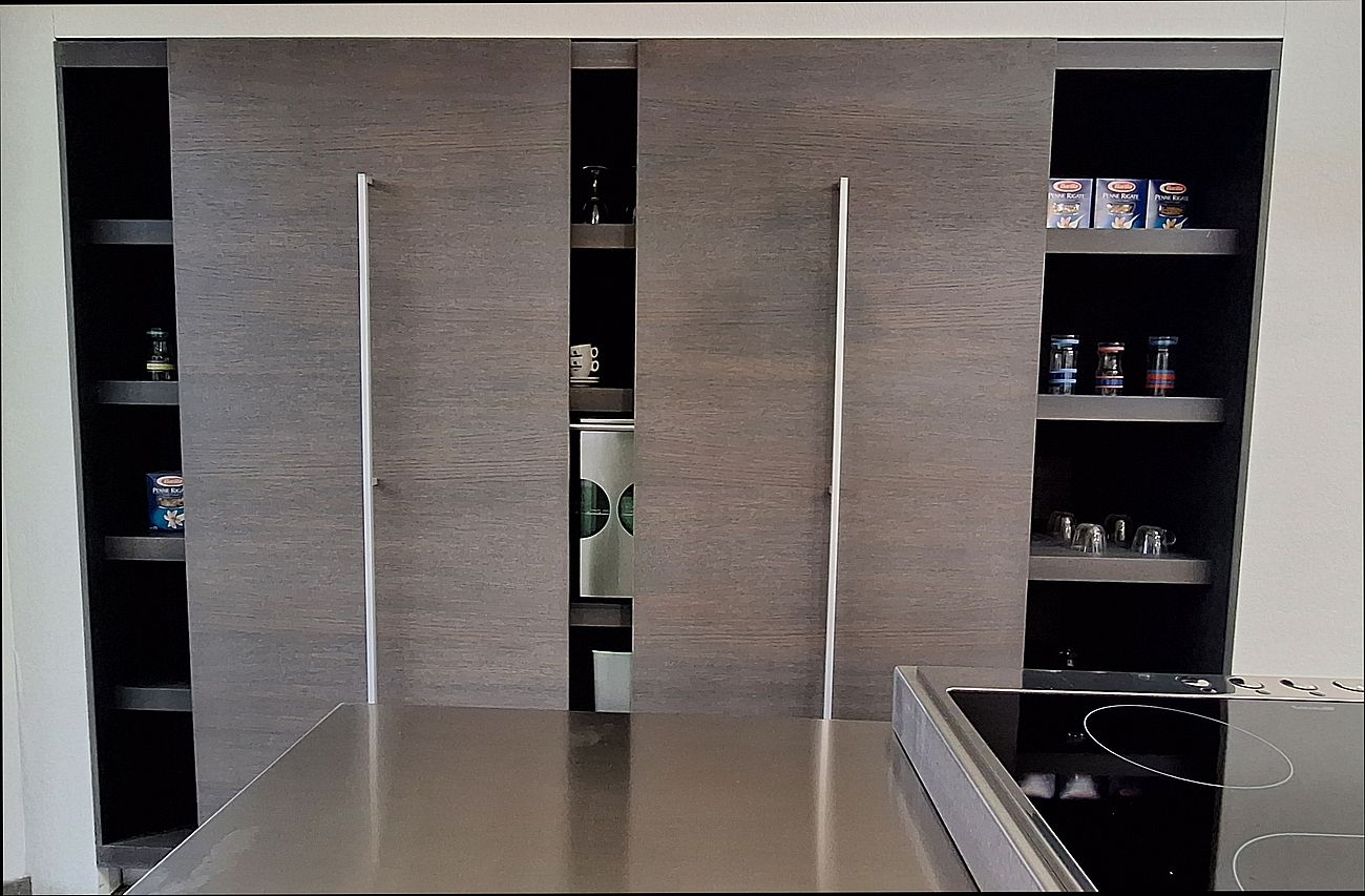 - Elektrische Schiebetüren an Funktionswand und Oberschränken