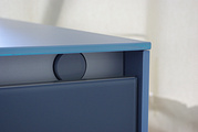 Kunststoff reinweiß mit lackähnlicher Oberfläche matt und Glasoptik-Stufenkante, Arbeitsplatten aus Sekuritglas mit Antiscratchbeschichtung, Farbe stahlblau